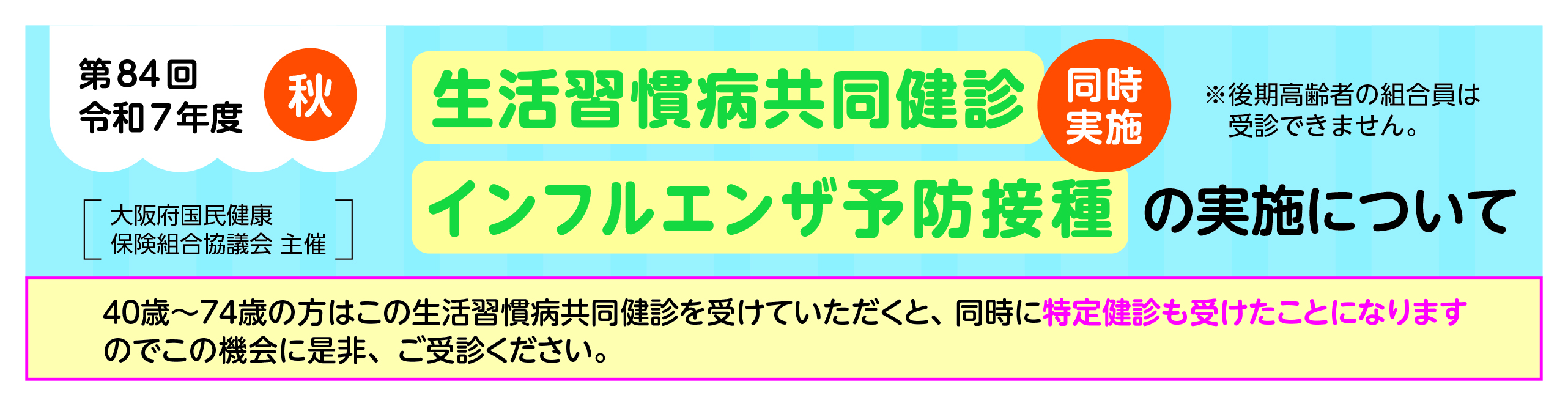 | ※ | 既に令和7年度春(5/19~8/31実施分)の生活習慣病共同健診を受けられた方は、今回は受けられません。インフルエンザ予防接種のみ接種可能です。 |